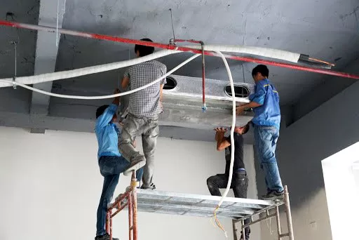 Lắp đặt hộp gió vào giá treo trên trần của công trình